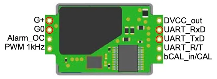 Pins on the SenseAir S8. Only the ones marked with a red circle need to be connected.